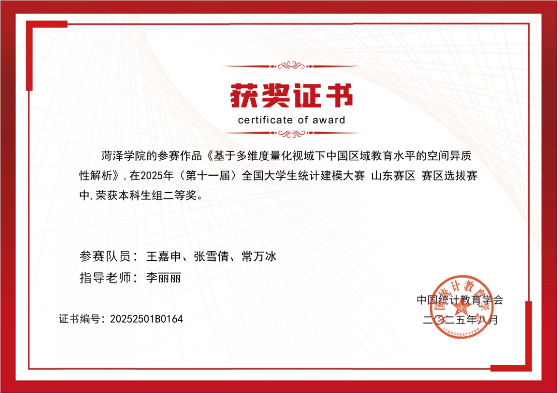 2025年6月,菏泽学院大学生创新训练项目“多维度量化视域下中国区域教育水平的空间异质性解析”,获校级立项;