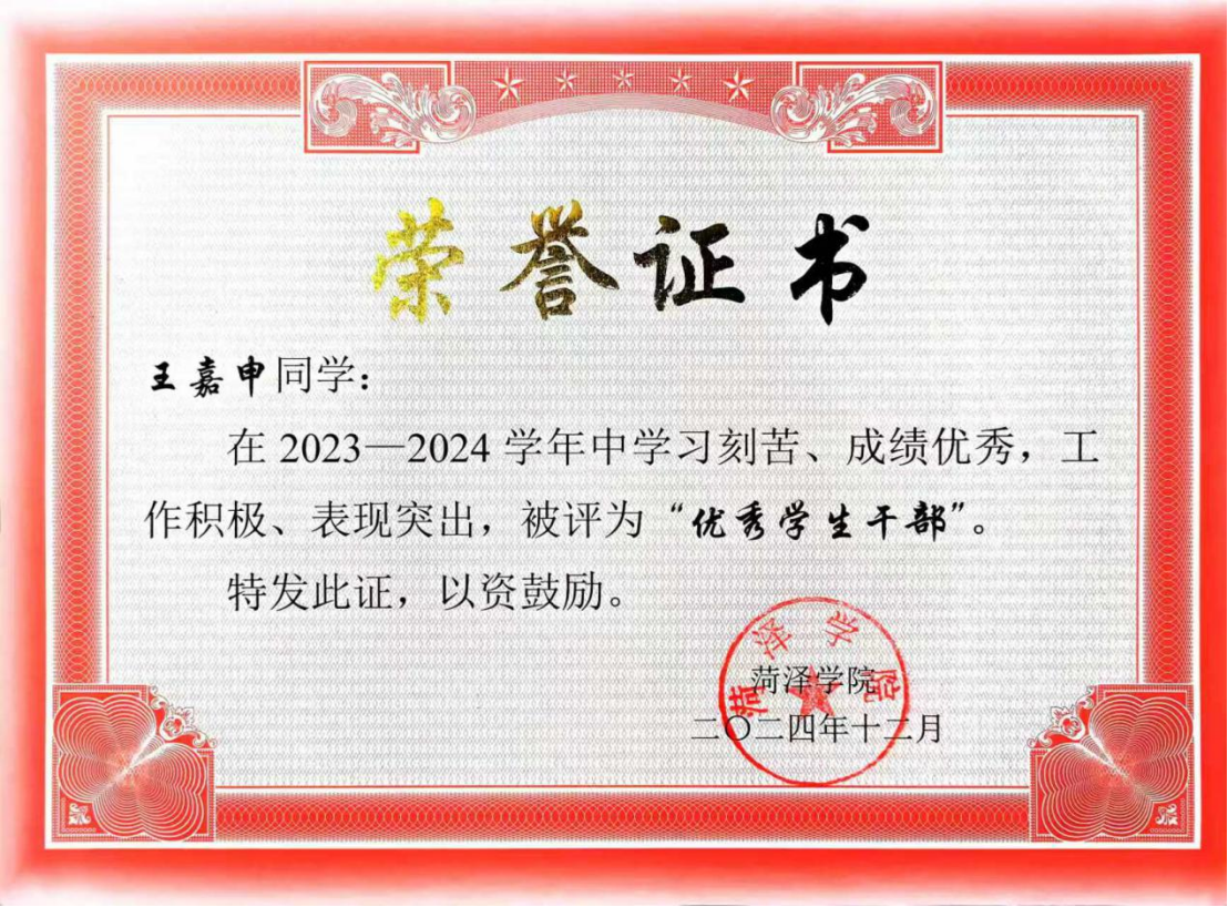 2024年12月,获菏泽学院“优秀学生干部”称号;