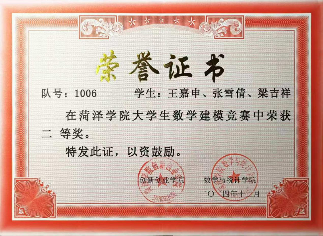 2024年12月,在菏泽学院大学生数学建模竞赛中,获校级二等奖;