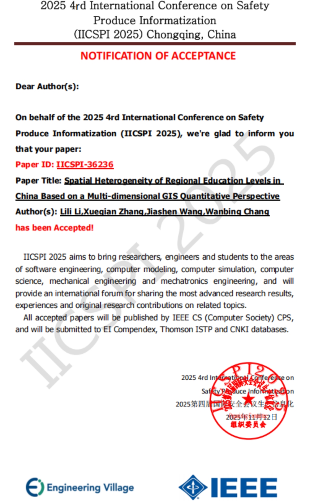 2025年11月,“Spatial Heterogeneity of Regional Education Levels in China Based on a Multi-dimensional GIS Quantitative Perspective”论文在EI发表成功;