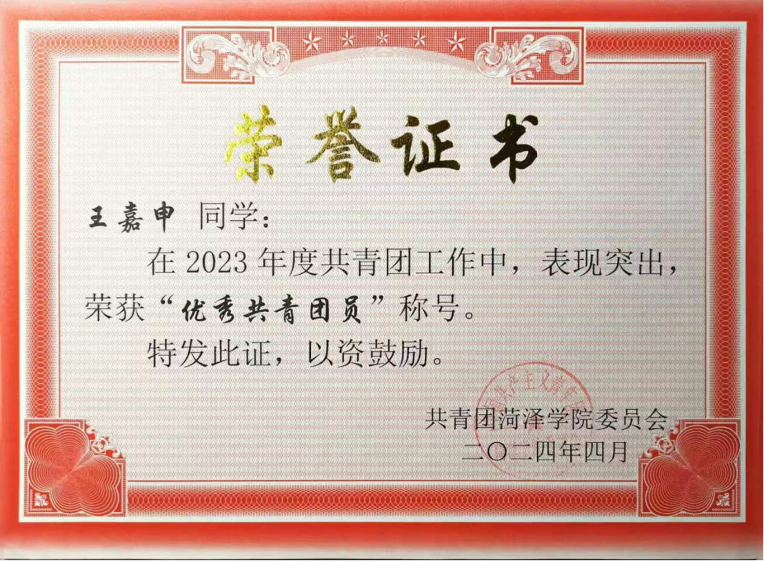 2024年04月,获菏泽学院“优秀共青团员”称号;