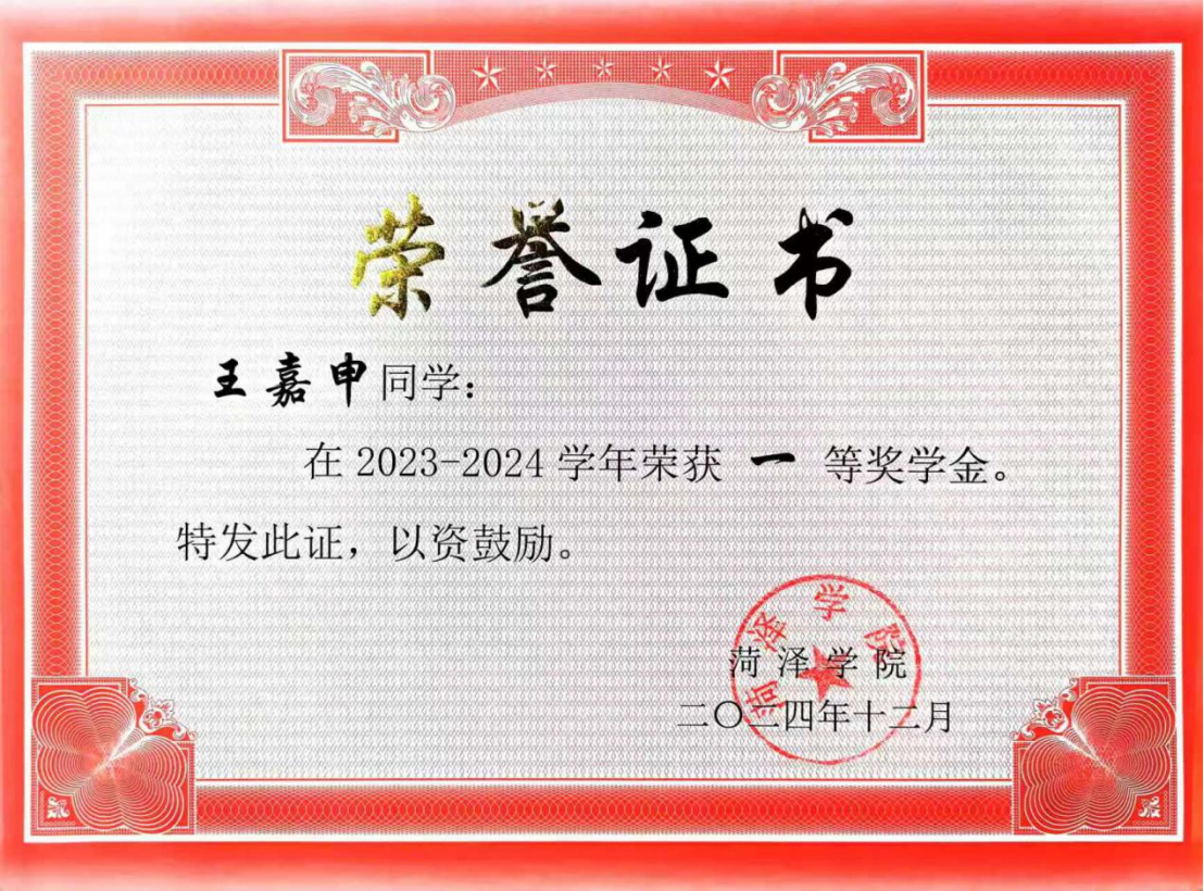 2024年12月,获菏泽学院一等奖学金;