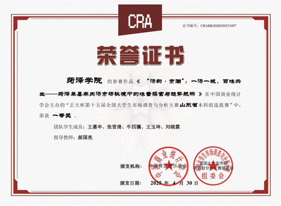 2025年4月,在“正大杯”第十五届全国大学生市场调查与分析大赛中,获省级一等奖;