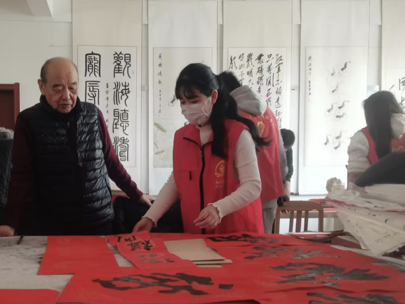 在此次“笔墨传情,年味暖社区”社区志愿服务活动中,我以大学生志愿者的身份,和小朋友们一同沉浸在春联文化的深厚底蕴里。我们认真聆听书法老师讲解“福”字的演变历程与春联的平仄对仗知识,并在老师的指导下提笔练习。活动中,我主要负责整理满载祝福的书法作品,细心晾挂、分类摆放尚未干透的春联。以笔为媒,以联传情,这不仅是一次生动的书写实践,更是一场鲜活的文化传承。在志愿服务的过程中,我真切体会到了奉献的快乐,也感受到中华优秀传统文化带来的温暖力量。