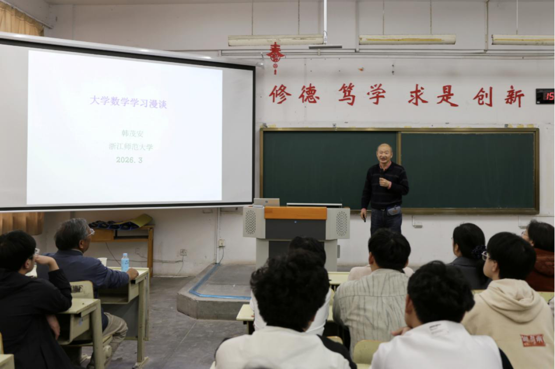 报告会上,韩茂安教授带来题为“大学数学学习漫谈”的报告。他以自身求学阶段的学习经历以及在数学教学与研究岗位上三十余年的实践感悟为线索,分享了大学数学的学习方法、科研入门路径与科研论文写作经验。韩教授特别指出,大学生和年轻教师应注重学习效率的提升,善于在实践中发现问题、在交流中深化理解,通过持续积累与主动思考实现学术成长。他鼓励同学们敢于挑战难题,积极参与科研项目,不断提升自身的学术素养与创新能力。