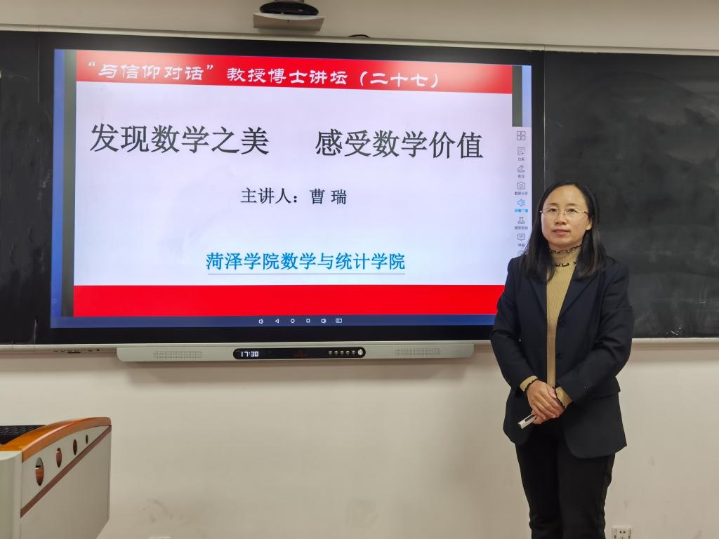 为了让同学们更深刻地了解数学,走进数学文化,感受数学的重要性,10月18日,曹瑞博士做客我院第二十七期“与信仰对话”讲坛,带来题为“发现数学之美 感受数学价值”的报告,2020级数学与应用数学专业全体学生聆听报告会。报告会由辅导员李新坤主持。