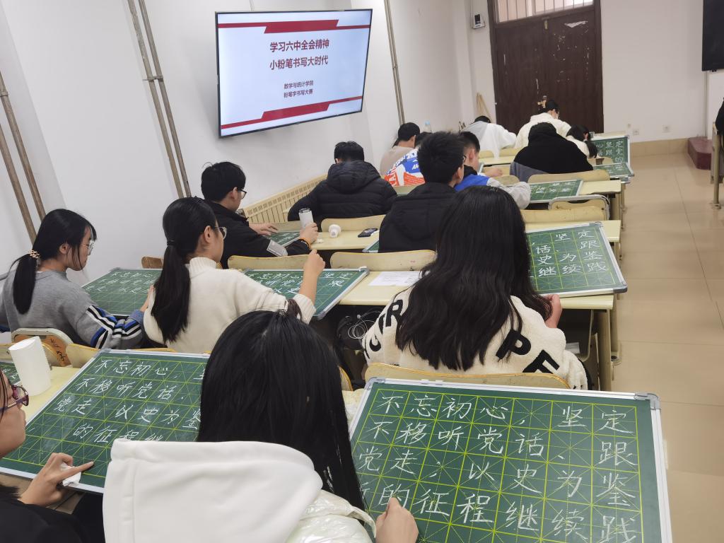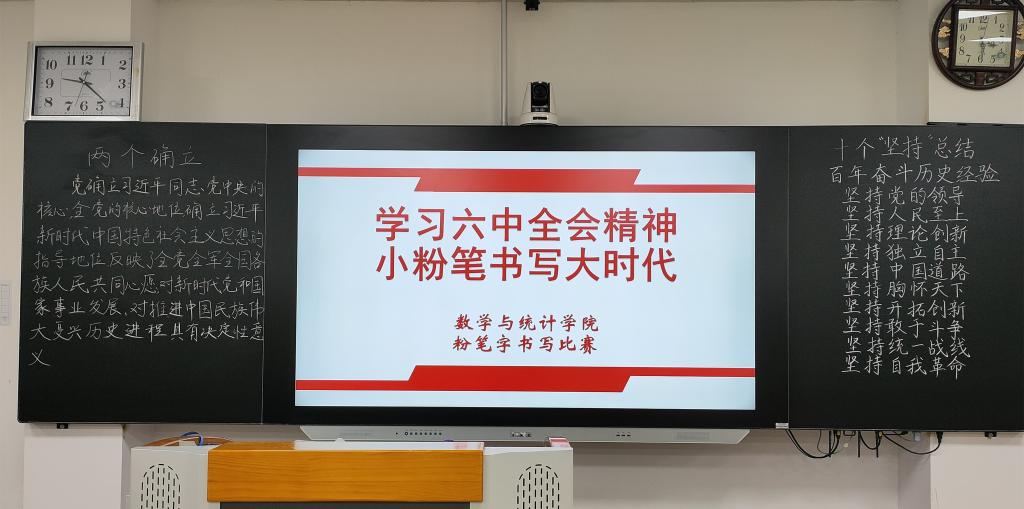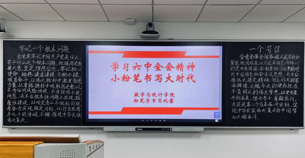 比赛分两个阶段进行。第一阶段为集体学习《中共中央关于党的百年奋斗重大成就和历史经验的决议》(以下简称《决议》)。第二阶段为粉笔字现场书写,书写内容为从《决议》中选出的语句。同学们聚精会神,细琢慢写,一撇一捺,提按分明,一根根粉笔在手中恣意飞扬、挥洒自如,一笔一划都透露着认真的态度。